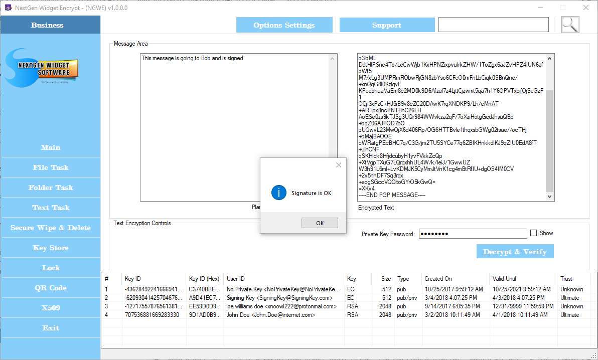 If verification is successful you will receive the message "Signature is OK" as the message is generated in the message area block.