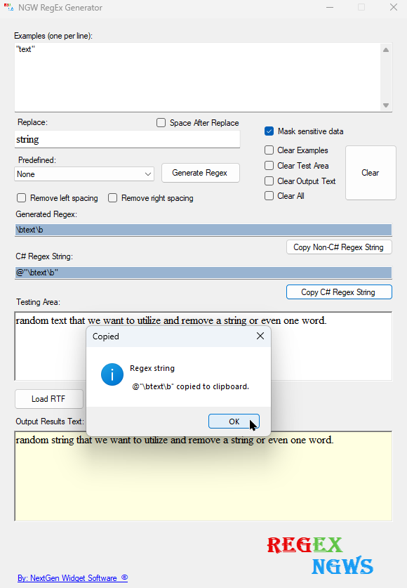 One of the neat features of NGW RegEx Generator is that it gives the C# string of the expression that can be used so that a developer can easily incorporate the expression into their application.