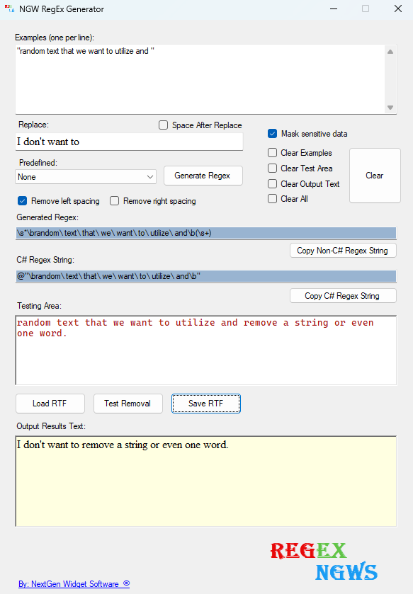 4. Click the "Generate Regex" button and the generated C# code string is easy to see. However, we need to first test to make sure the string actually works by clicking the Test Removal button.