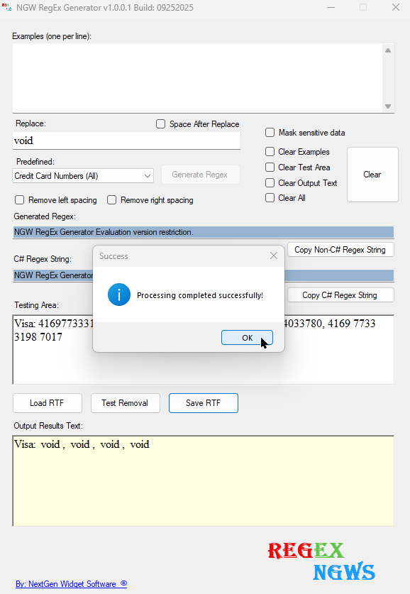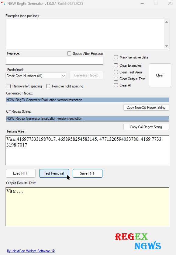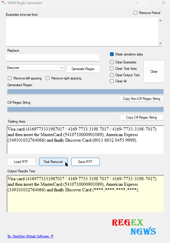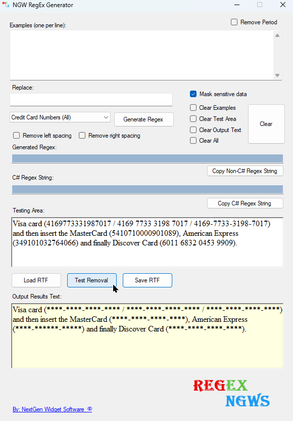 The masking will mask each of these formats; 4169773331987017; 4169 7733 3198 7017 or 4169-7733-3198-7017. You can choose to mask individual credit card numbers or all of them in one shot. Let's check out an example of all in one shot. Just select the (Credit Card Numbers (All)) in the drop-down (4) and then click the Test Removal (14) after adding your credit card numbers or number in the Testing Area (12).