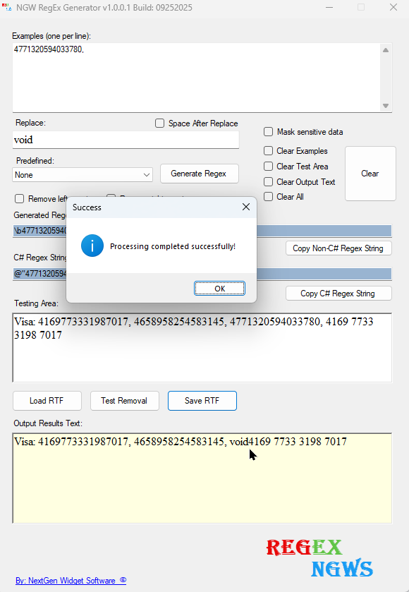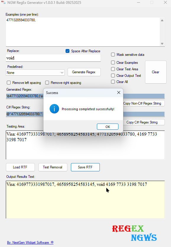 Now, spacing at times can be problematic so we've tried to fix some of the issues. In this example were going to remove "4771320594033780," from the Visa numbers and replace it with the word void. Now, what you'll notice is the word "void"sits right on top of the number four with no spacing. The image below on the left will be no spacing behind the word void and the image on the right as the (space after replace) checkbox is ticked you will see that there is now spacing after the word void.