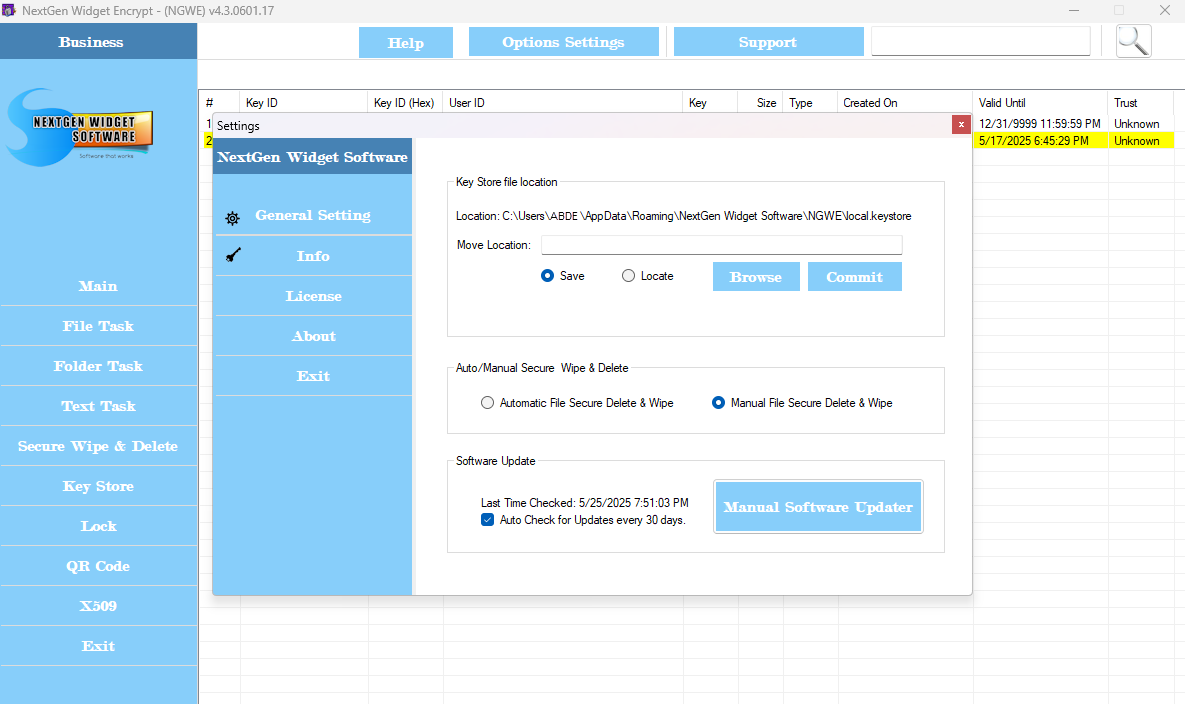 It will create a desktop shortcut and in the program start up it creates a shortcut to the uninstall program. Uninstalling the program is just as easy as installing it. However, the uninstaller will not remove your Key Store file. This file is created by NextGen Widget Encrypt and as a result the installer is not aware of it.