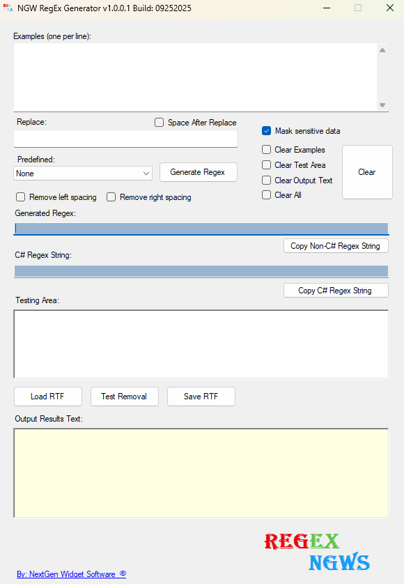 NGW RegEx Generator by NEXTGEN WIDGET SOFTWARE is a powerful, reliable, and user-focused tool that simplifies regular expression creation and application. Its unique directory memory feature, combined with an intuitive interface, predefined patterns, background processing, and seamless clipboard integration, sets it apart from competitors like Regex101, RegExr, Expresso, and RegexBuddy. Whether you're a developer integrating RegEx into C# projects or a professional processing large documents, this tool delivers exceptional performance, versatility, and convenience. Highly recommended for its efficiency and thoughtful design.
